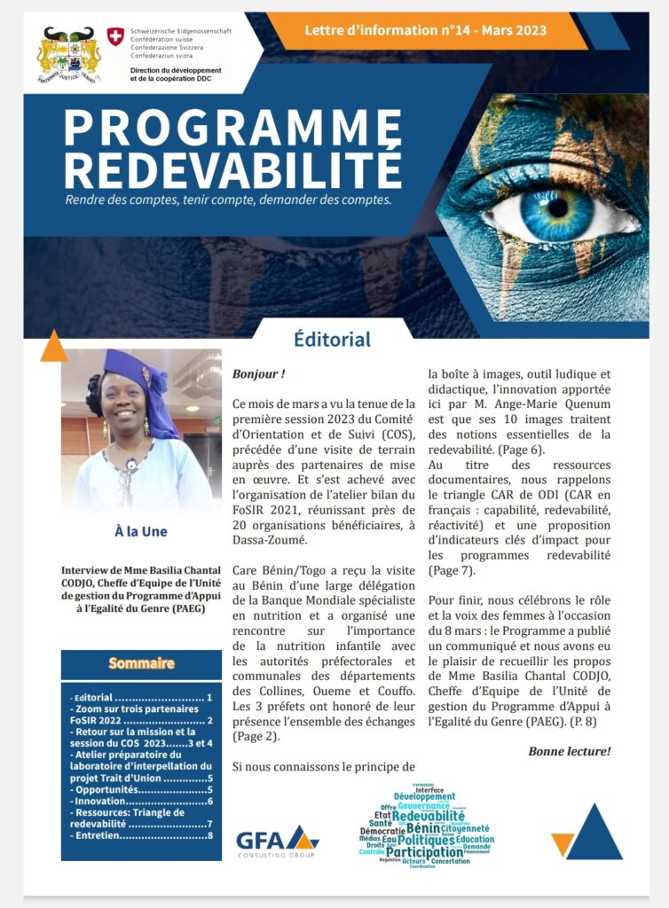 Programme Redevabilité Mars 2023Par gfa / 30 juin 2025 Cliquez ici pour télécharger gratuitement le Bulletin d’Information mensuel du Programme Redevabilité Mars 2023