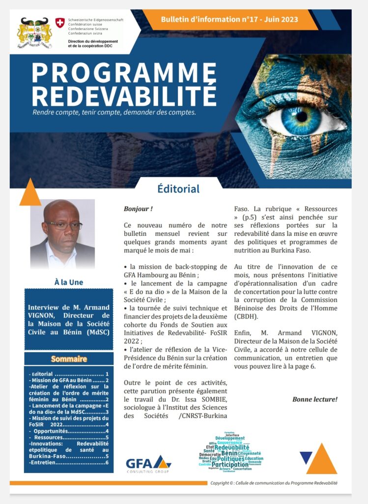Programme Redevabilité Juin 2023Par gfa / 30 juin 2025 Cliquez ici pour télécharger gratuitement le Bulletin d’Information mensuel du Programme Redevabilité Juin 2023